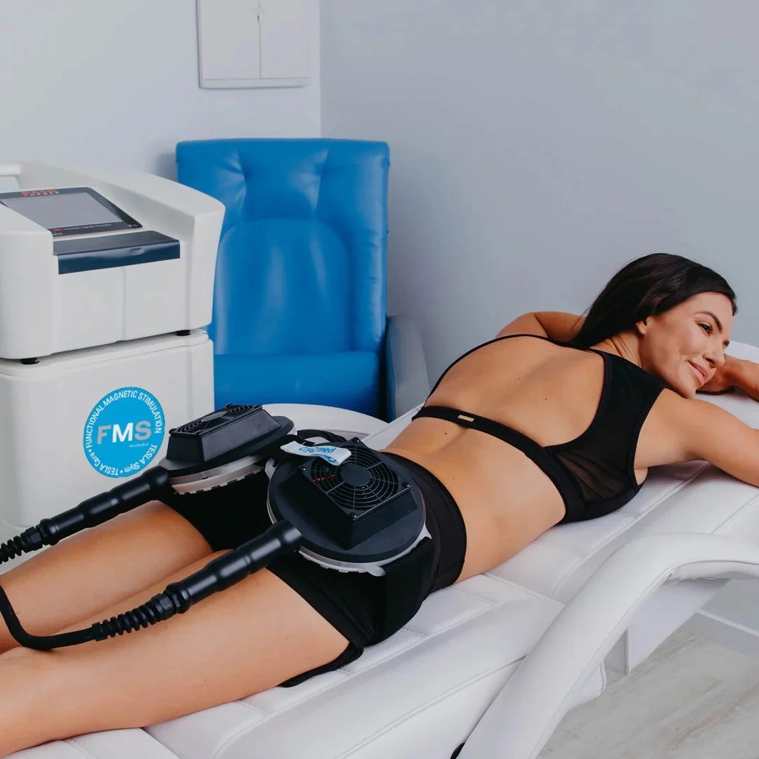 FMS therapy is a cutting-edge, non-invasive treatment that uses magnetic fields to stimulate and strengthen your gluteal muscles. This advanced technology provides the equivalent of thousands of perfectly executed squats in a single session, all while you relax comfortably.